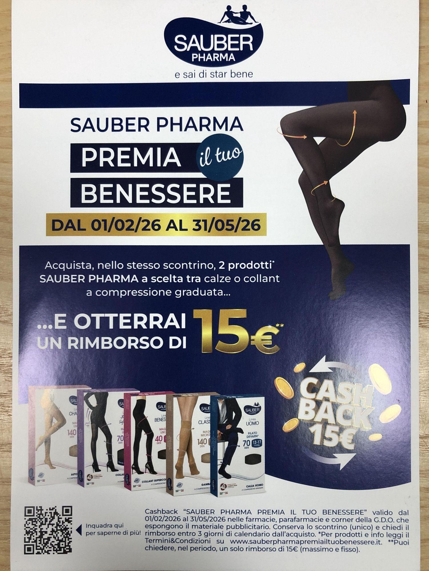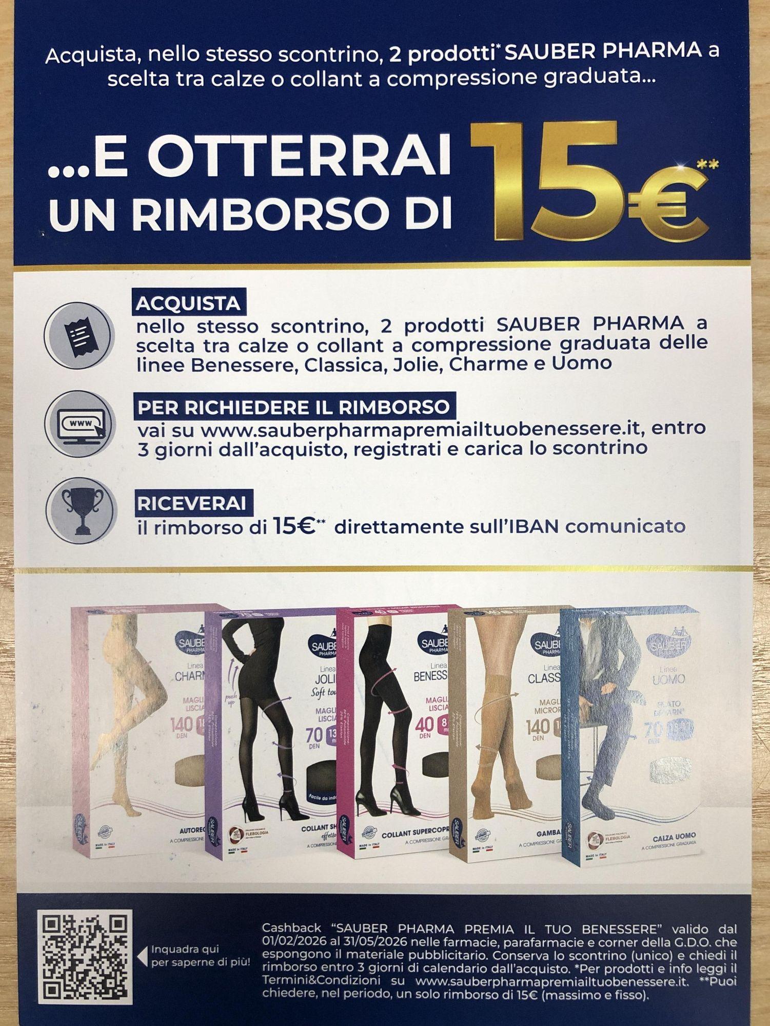 Dal 01/02/2026 al 31/05/2026 con l’acquisto di 2 prodotti SAUBER PHARMA (calze o collant a compressione graduata) nello stesso scontrino…